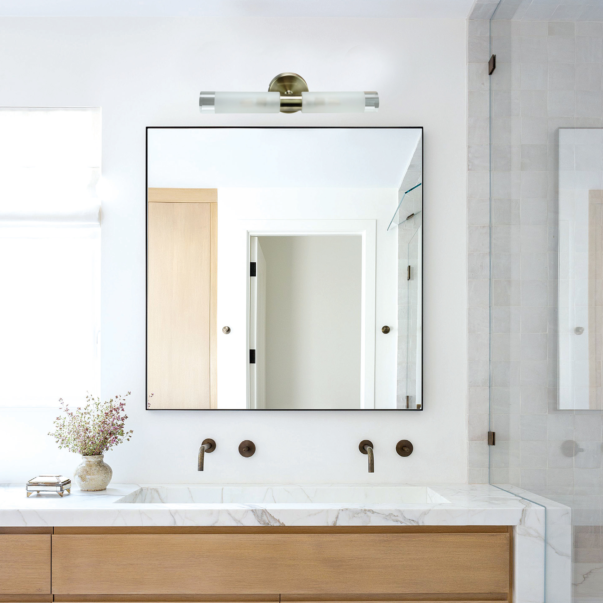 Πρόκειται για ένα επιτοίχιο φωτιστικό κατασκευασμένο από μέταλλο σε χρώμιο απόχρωση με δύο λαμπτήρες που καλύπτονται από κυλινδρικό γυαλί αμμοβολής με διάφανες λεπτομέρειες. Είναι η ιδανική επιλογή για φωτισμό μπάνιου τοποθετημένο πάνω από τον καθρέπτη αφού το φως διαχέεται ομοιόμορφα.