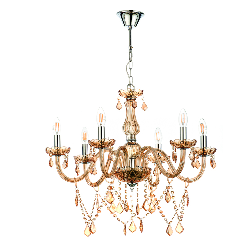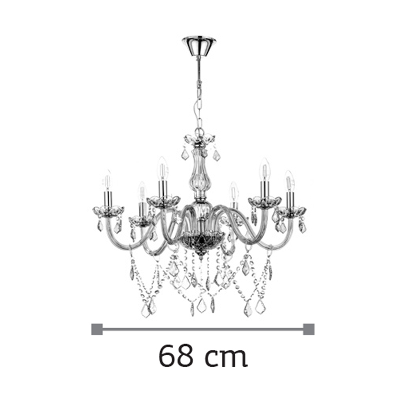 Πρόκειται για ένα μελί γυάλινο κρεμαστό φωτιστικό με έξι λαμπτήρες. Τόσο τα μελί κρύσταλλα που κρέμονται όσο και οι χρώμιο μεταλλικές λεπτομέρειες του προσδίδουν μια επιπλέον λάμψη. Η χρώμιο μεταλλική ανάρτηση είναι ρυθμιζόμενη και προσαρμόζεται στον κάθε χώρο.