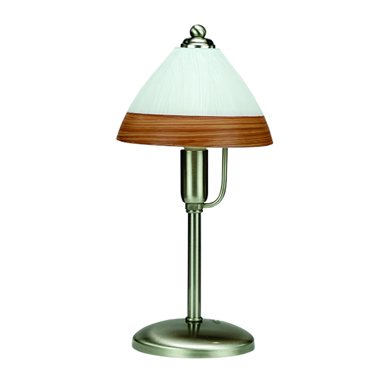Πρόκειται για ένα νίκελ ματ επιτραπέζιο φωτιστικό. Το γυαλί συνδυάζει το λευκό και το καφέ καθιστώντας το ιδιαίτερο καλύπτοντας ταυτόχρονα τον λαμπτήρα.