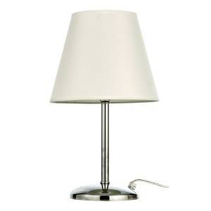 Πρόκειται για ένα μεταλλικό επιτραπέζιο φωτιστικό σε χρώμιο απόχρωση. Το υφασμάτινο καπέλο το συνοδεύει συμπληρώνοντας τη μίνιμαλ σχεδίασή του.