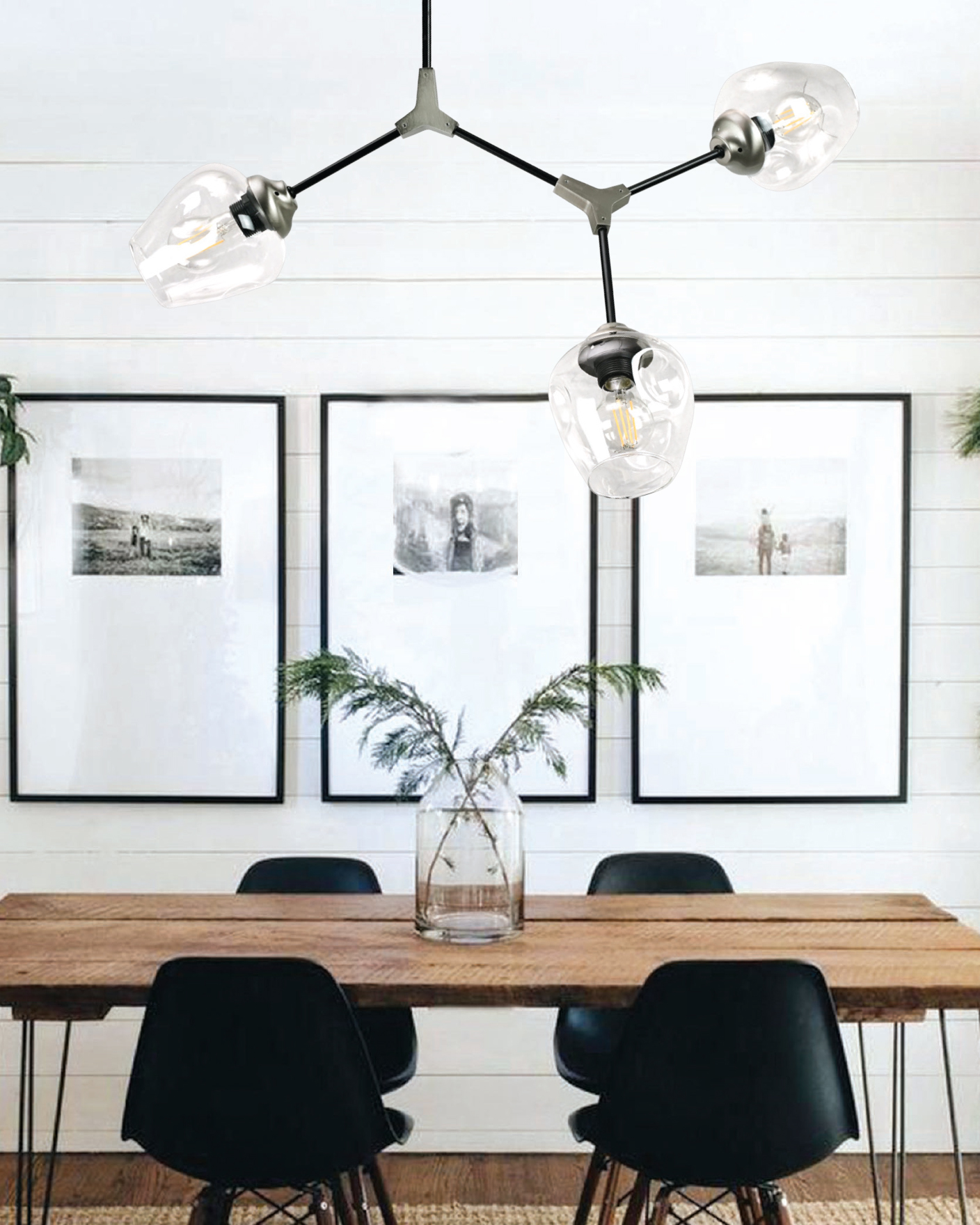 Πρόκειται για ένα μεταλλικό κρεμαστό φωτιστικό μαύρου χρώματος με νίκελ διακριτικά στοιχεία και τρεις λαμπτήρες. Το γυαλί είναι διάφανο, αλλά υπάρχει και η επιλογή του φιμέ χρώματος. Ο βραχίονας με τους δύο λαμπτήρες κινείται για να λάβει το επιθυμητό σχήμα. Η μίνιμαλ σχεδίασή του το τοποθετεί σε οποιονδήποτε μοντέρνο εσωτερικό χώρο.