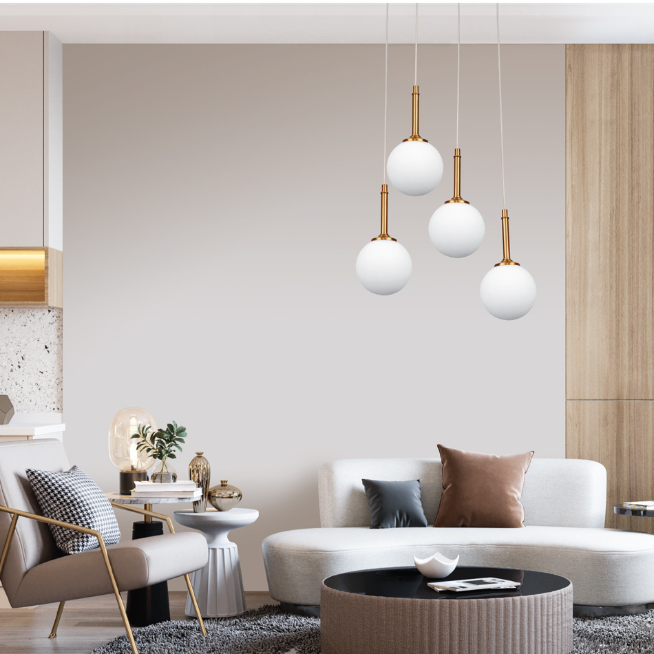 Πρόκειται για ένα χρυσαφί μεταλλικό φωτιστικό με λευκή οπαλίνα και τέσσερις λαμπτήρες. Το ύψος μπορεί να ρυθμιστεί ώστε να προσαρμοστεί στον μοντέρνο χώρο τοποθέτησής του.