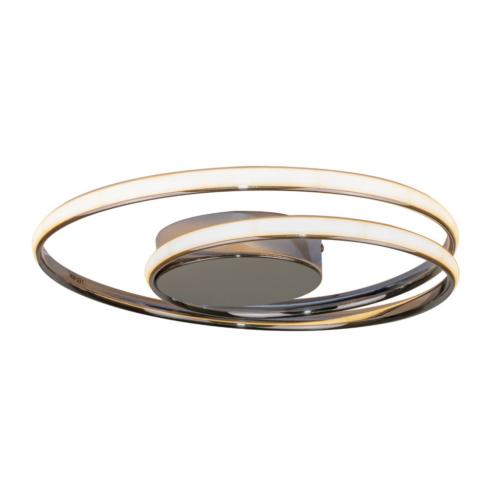 Πρόκειται για ένα χρώμιο φωτιστικό οροφής με κυκλική σχεδίαση κατασκευασμένο από αλουμίνιο. Η λευκή ακρυλική του επιφάνεια καλύπτει τον led φωτισμό θερμής απόχρωσης.