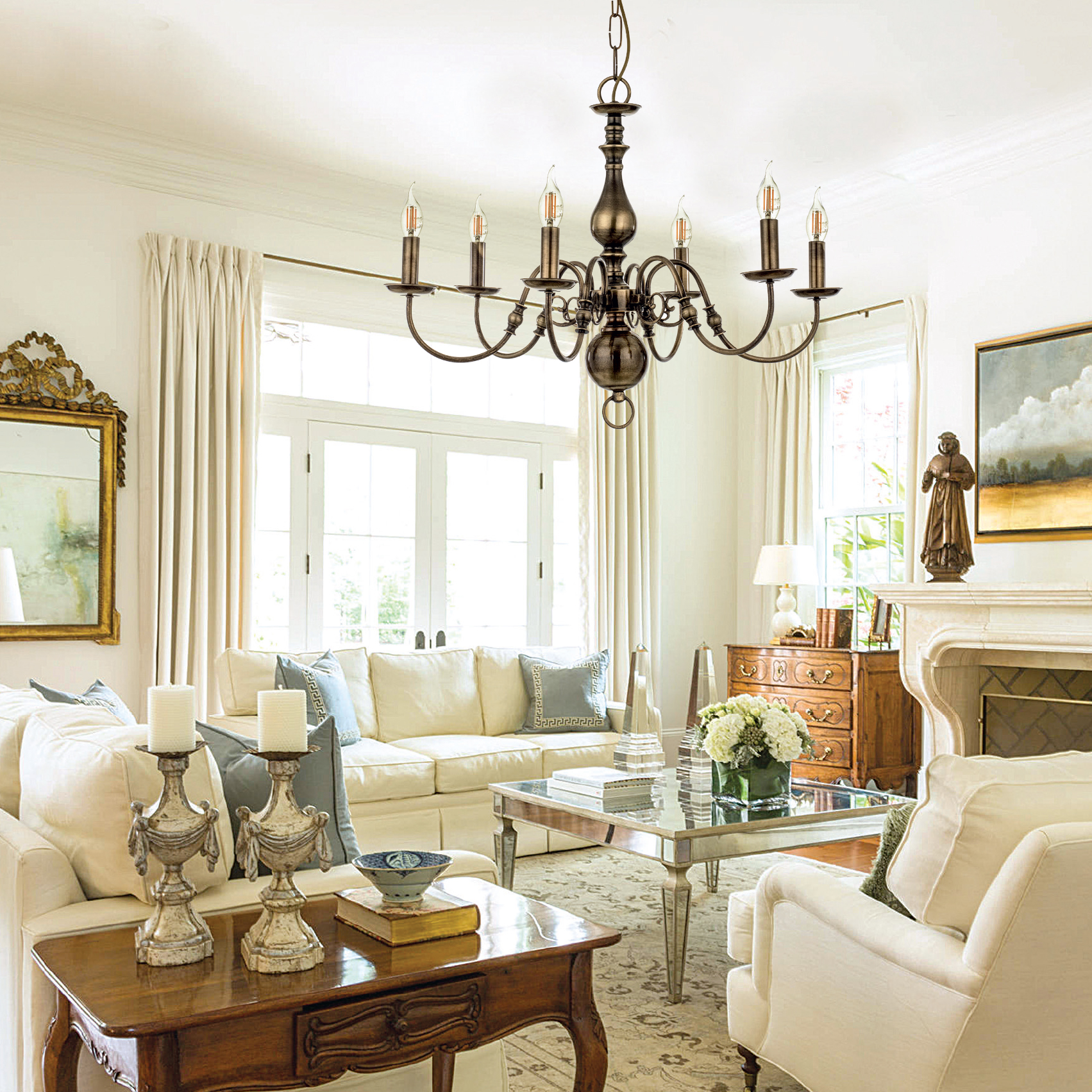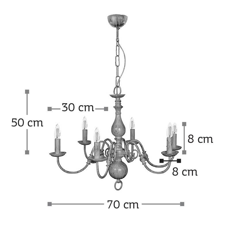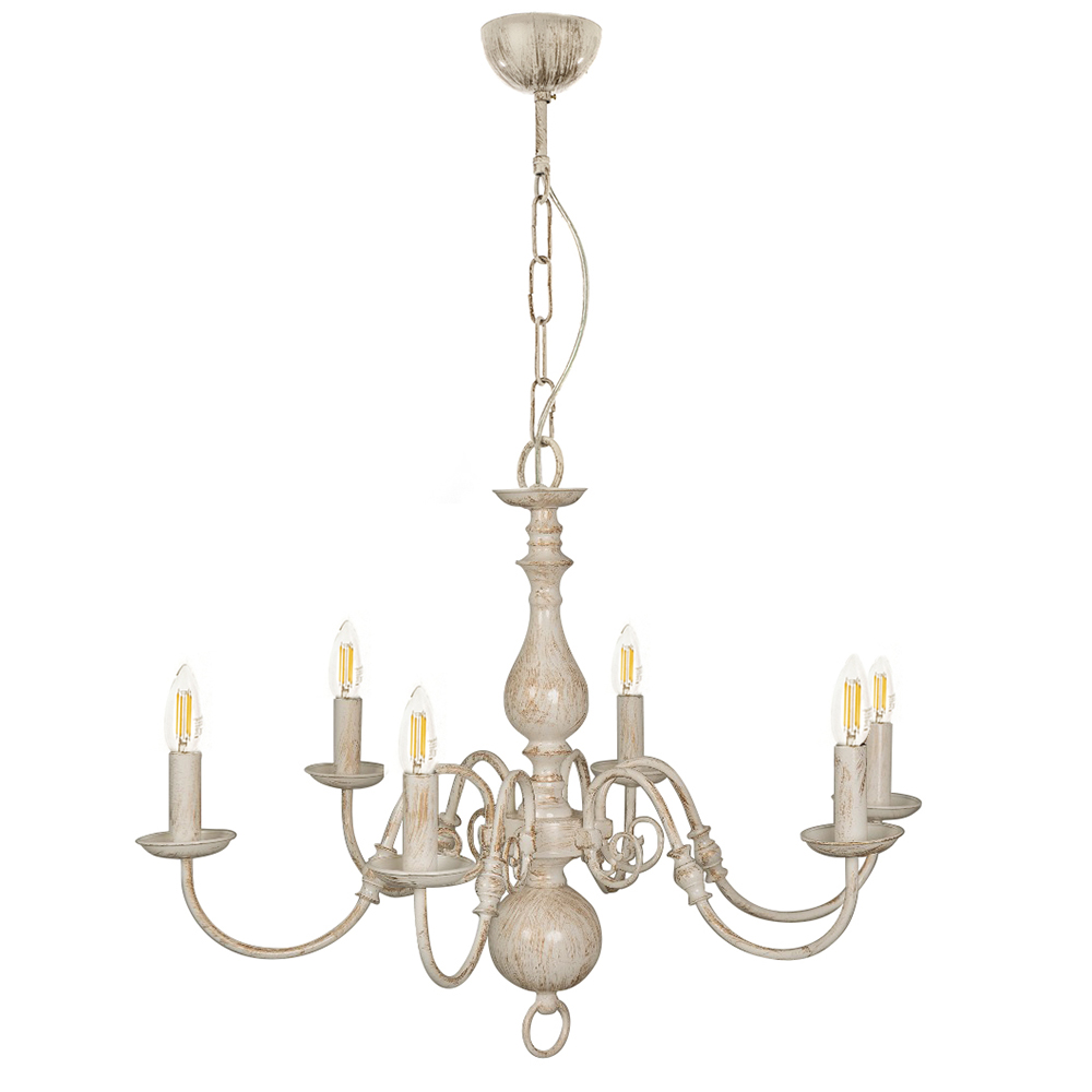 Πρόκειται για ένα κρεμαστό φωτιστικό από μέταλλο σε λευκή πατίνα με έξι λαμπτήρες. Κατάλληλο για διακόσμηση κλασσικών εσωτερικών χώρων. Η μεταλλική ανάρτηση είναι ρυθμιζόμενη για να προσαρμοστεί στον κάθε χώρο. Διατίθεται και λευκό υφασμάτινο καπέλο για πιο απαλό φωτισμό το οποίο θα πρέπει να ζητηθεί επιπλέον.