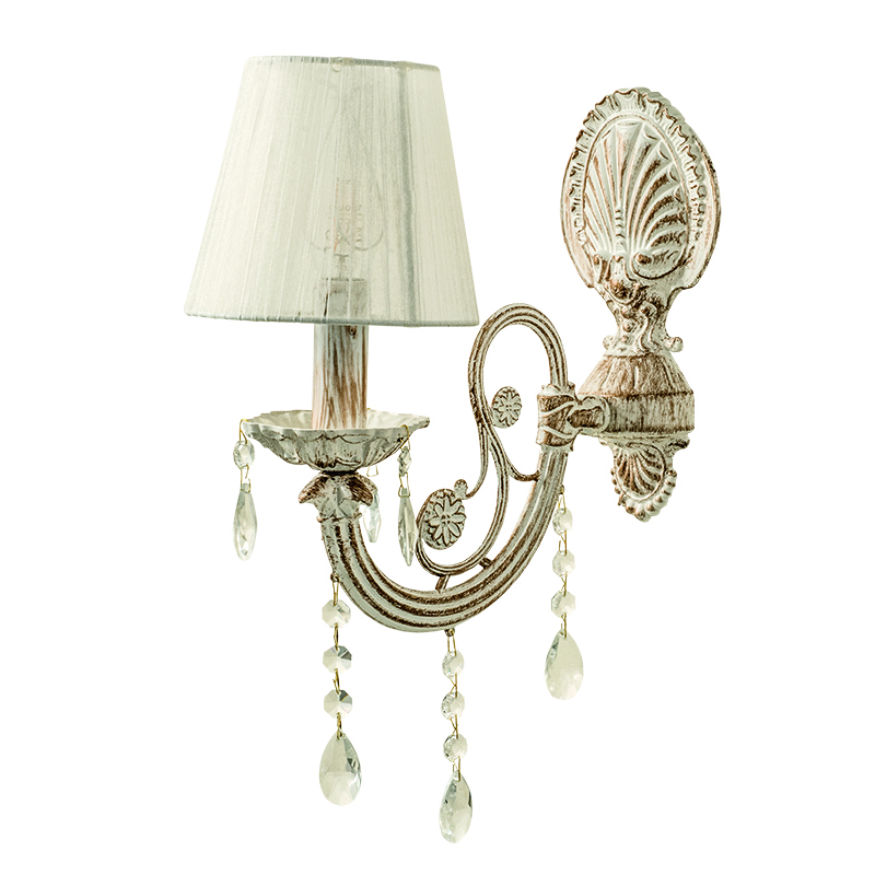 Πρόκειται για ένα μεταλλικό επιτοίχιο φωτιστικό σε απόχρωση μπεζ πατίνας. Τα κρύσταλλα δίνουν μια επιπλέον λάμψη, αλλά μπορούν και να αφαιρεθούν. Διατίθεται και λευκό υφασμάτινο καπέλα για πιο απαλό φωτισμό το οποίο θα πρέπει να ζητηθεί επιπλέον.