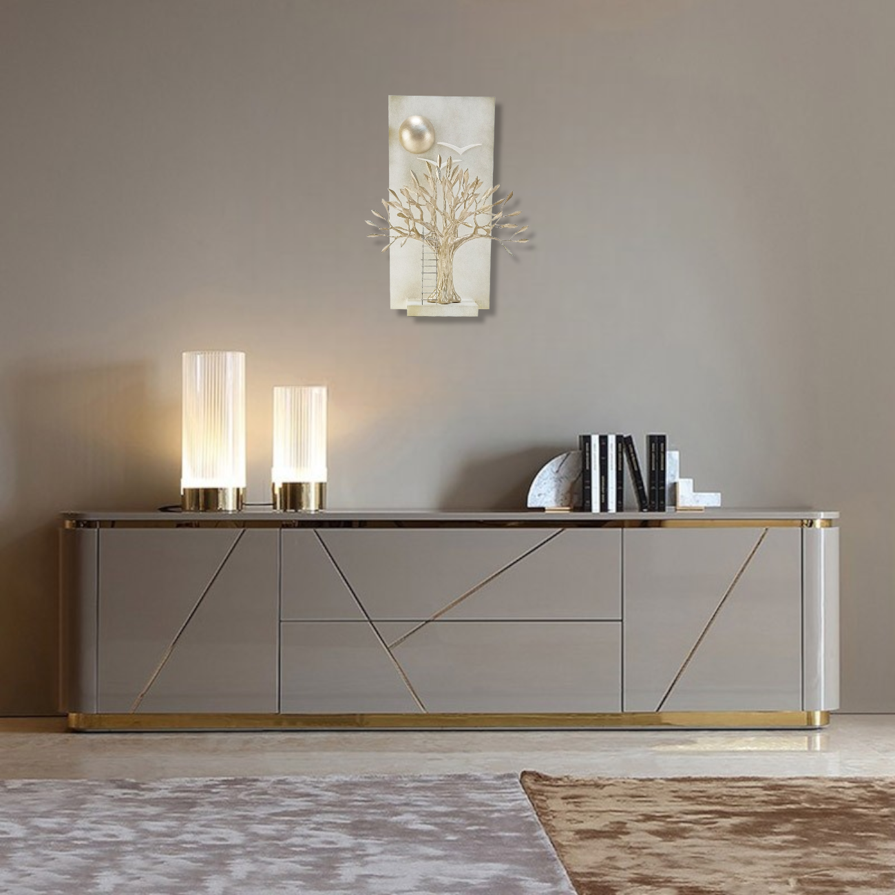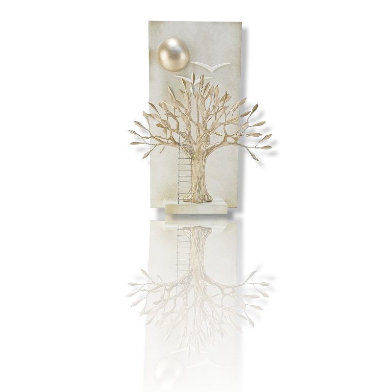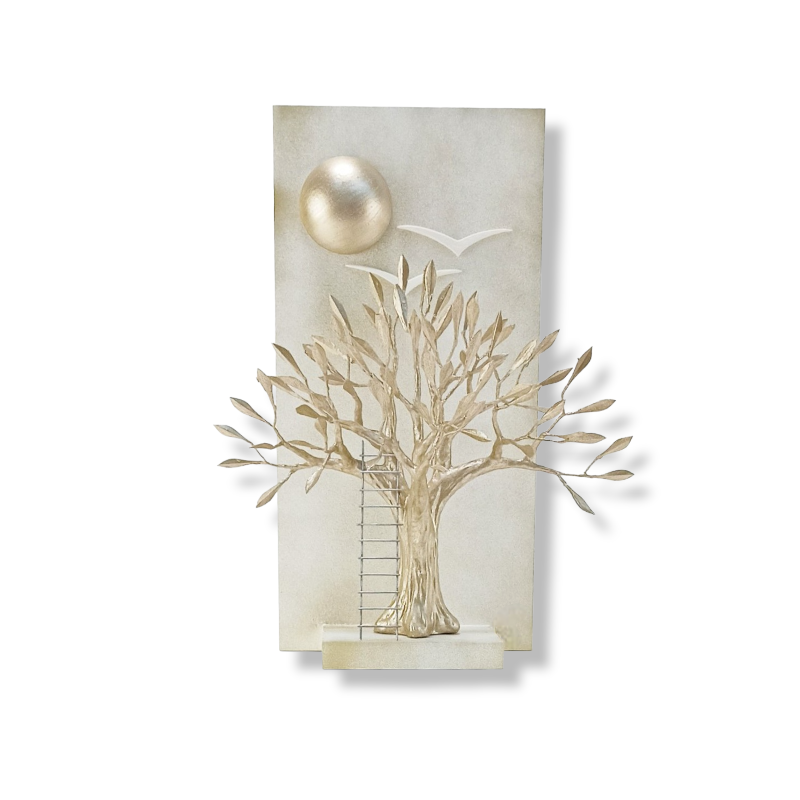 Χειροποίητη επιτοίχια και επιτραπέζια ελιά, σε χρυσές και λευκές αποχρώσεις. Ιδανική να στολίσει το τζάκι, μια κενή γωνιά του τοίχου στην κρεβατοκάμαρα, στο σαλόνι ή την τραπεζαρία.