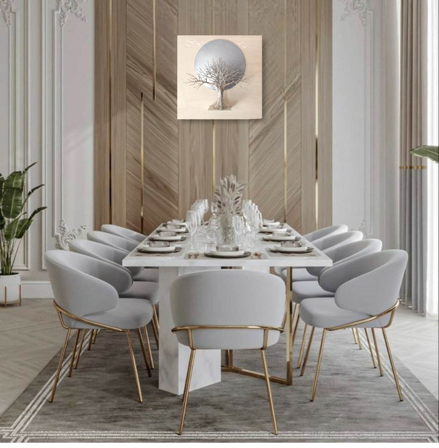 Χειροποίητη επιτοίχια ελιά σε ασημένιες και εκρού αποχρώσεις.