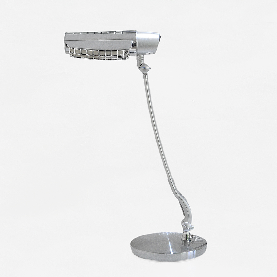 Επιτραπέζιο φωτιστικό γραφείου, με μεταλλική βάση σε νίκελ ματ και ασημί καπέλο. Με λειτουργικό στήριγμα για το το γραφείο. Ύψος: 52 εκ. Μήκος: 23 εκ. Λαμπτήρες: 1 τεμ. Τύπος Λαμπτήρων: E27(1*20WATT)