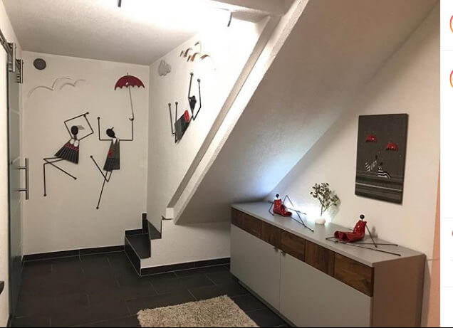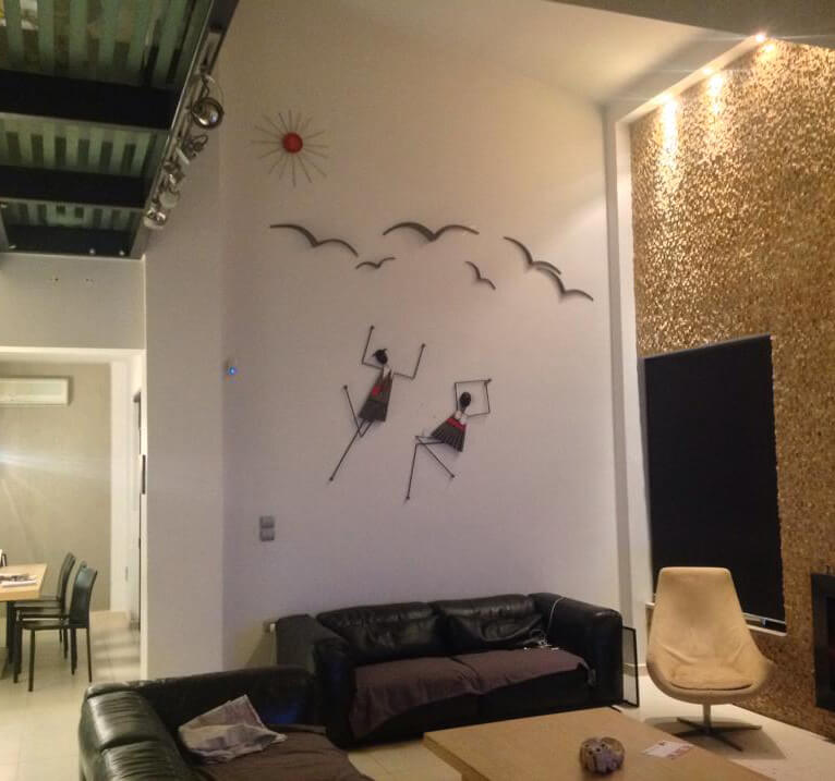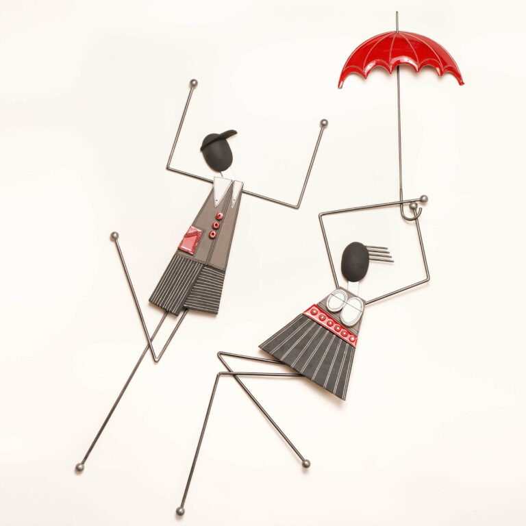 Φιγούρα τοίχου ανδρική, με ένδυμα σε διάφορα χρώματα πηλού Stoneware και λεπτομέρειες απο πορσελάνη, Γκρι και μαύρο πηλό και κόκκινο σμάλτο.Τοποθέτηση στον τοίχο με ενα σημειο στήριξης οπου ρυθμίζουμε την κλίση. Τα μεταλλικά στοιχεία αποσυναρμολογούνται στην μεταφορά.