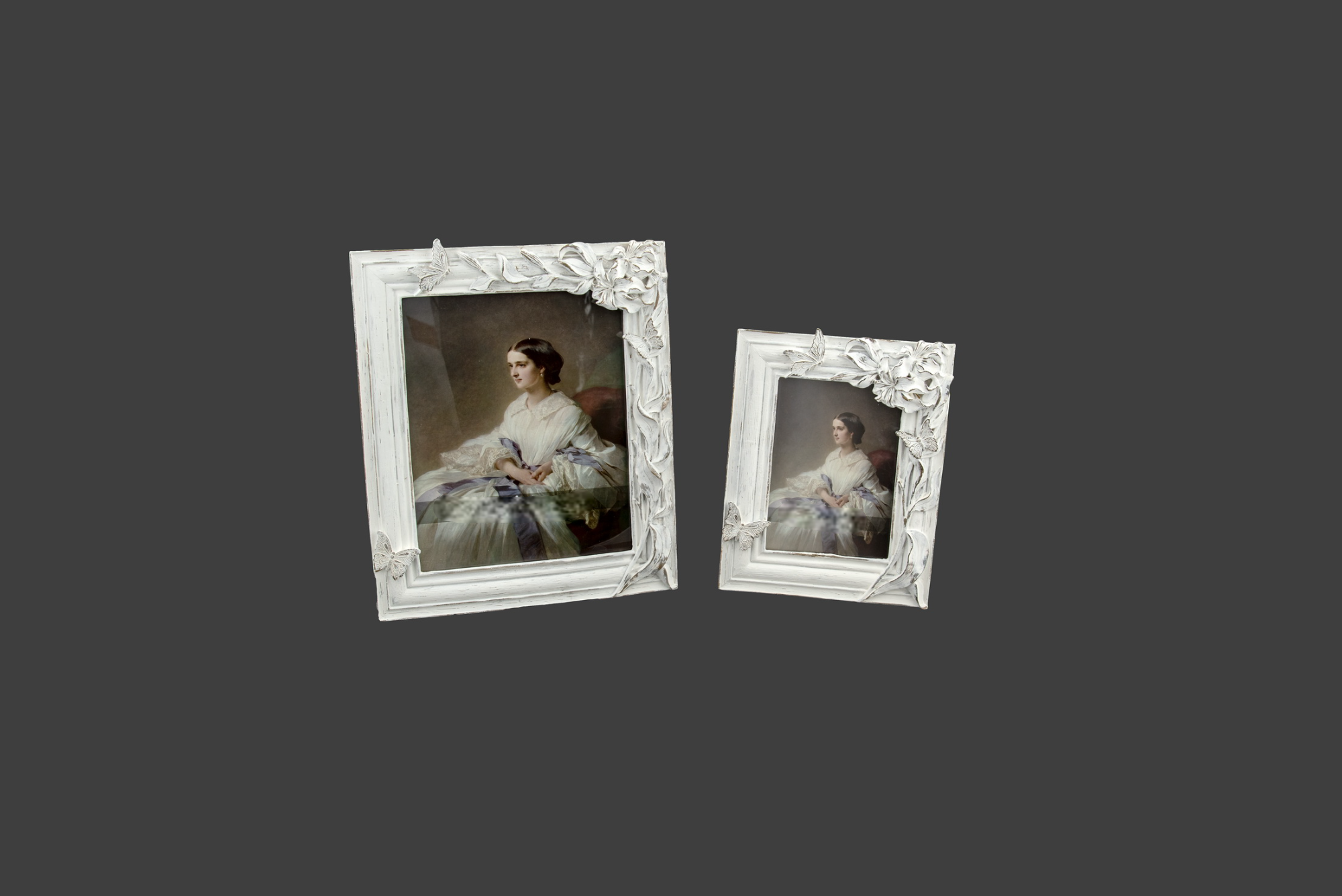 Κορνίζα ανάγλυφη με κρινάκια & πεταλούδες σε απόχρωση λευκού παλαιωμένου ξύλου.