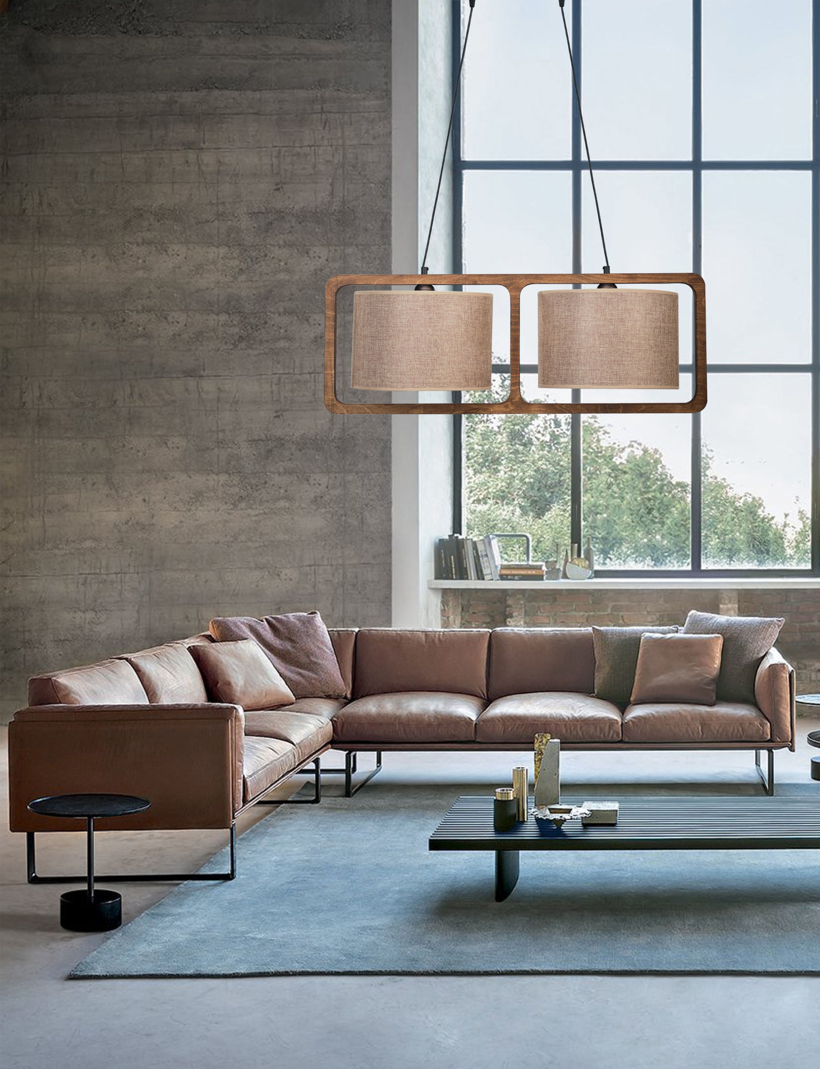 Φωτιστικό Πολύφωτο 2φ Ξύλο/Αμπαζούρ μόκα Ε27