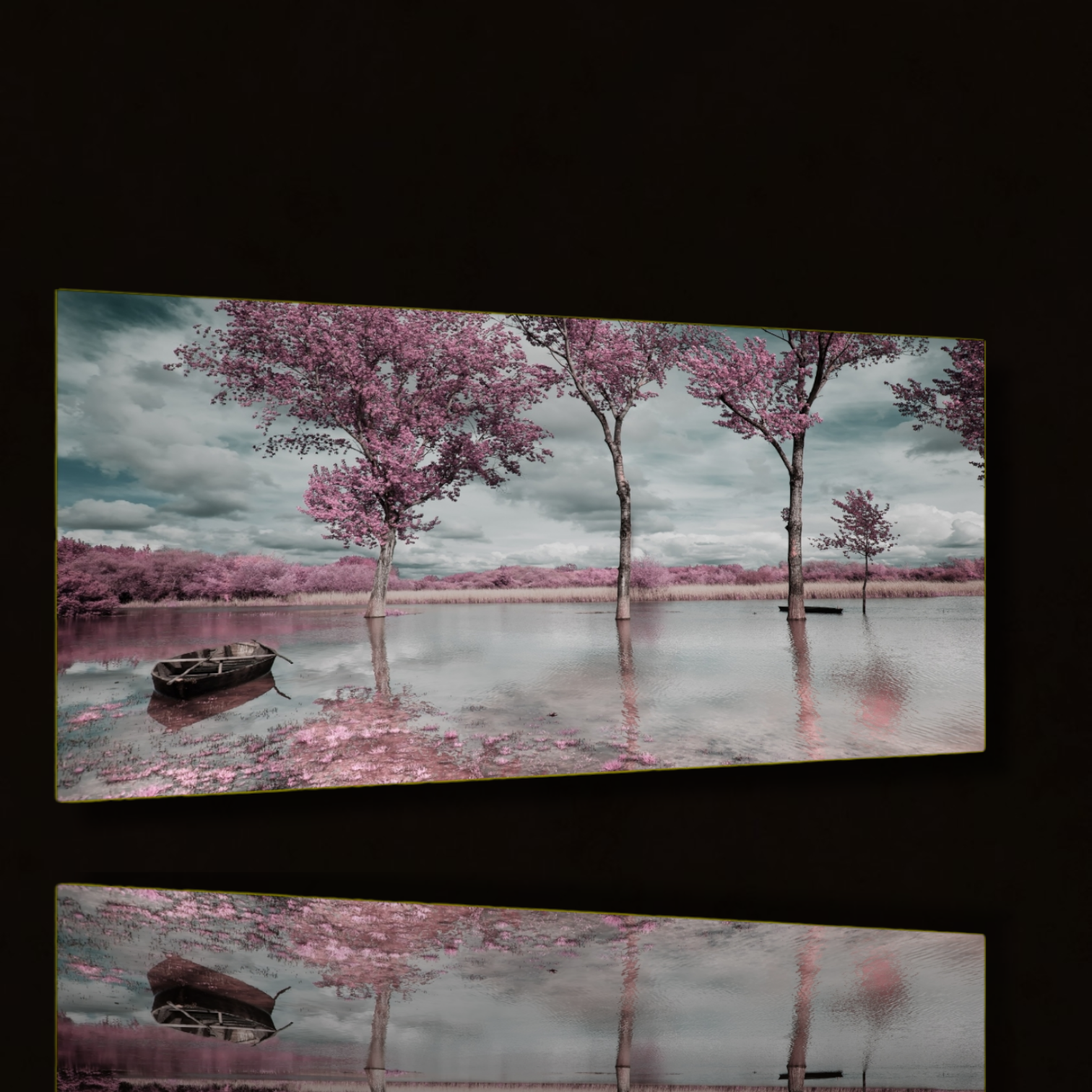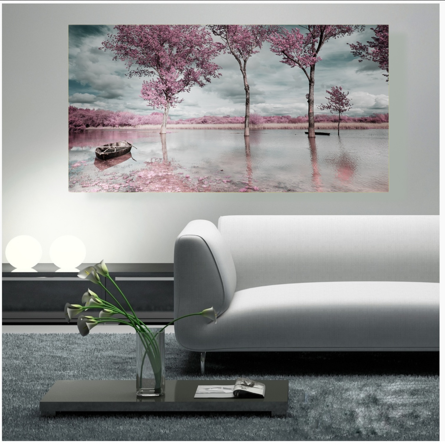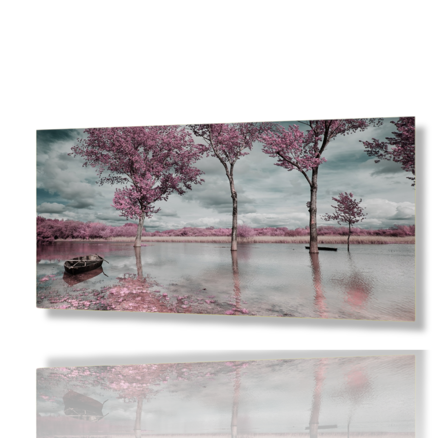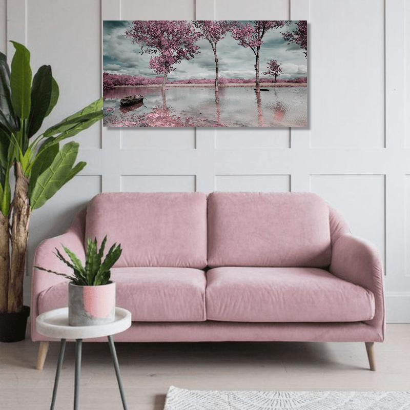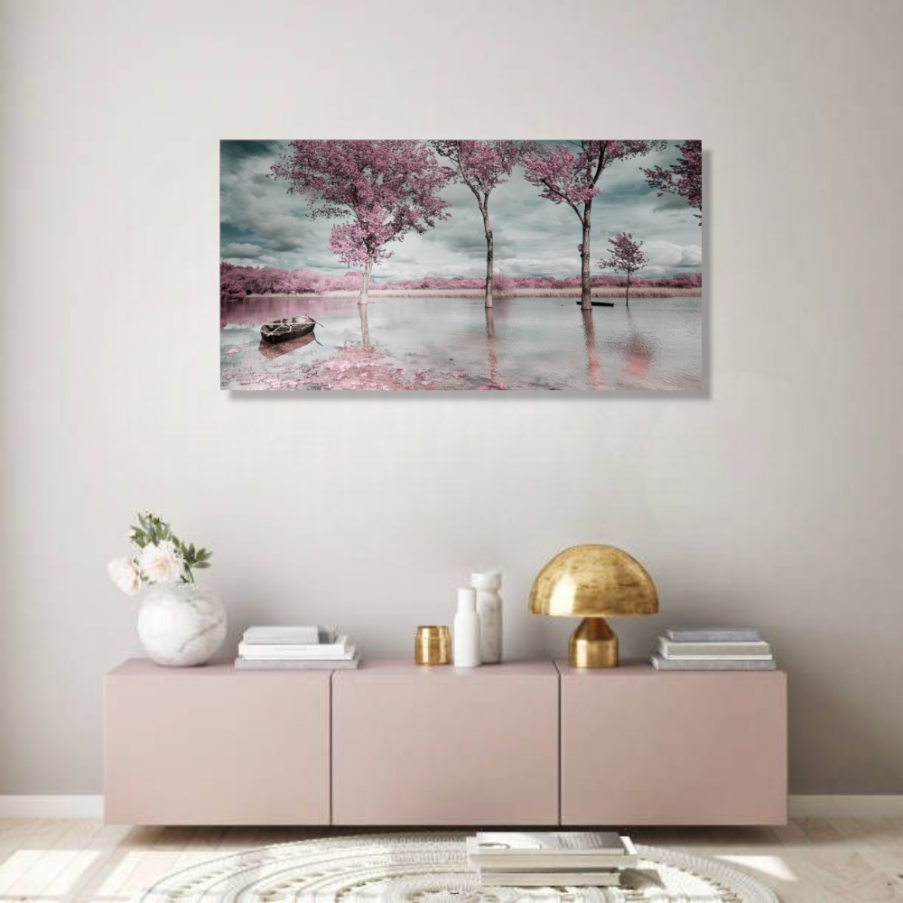 BDL057 - Πίνακας βάρκα σε λίμνη με ροζ δέντρα
