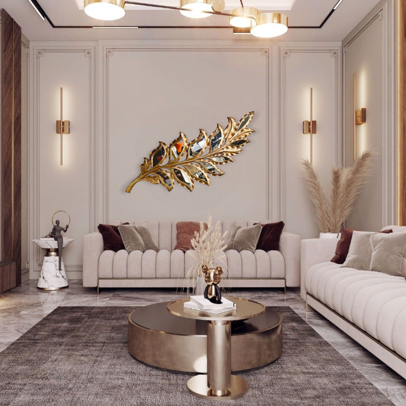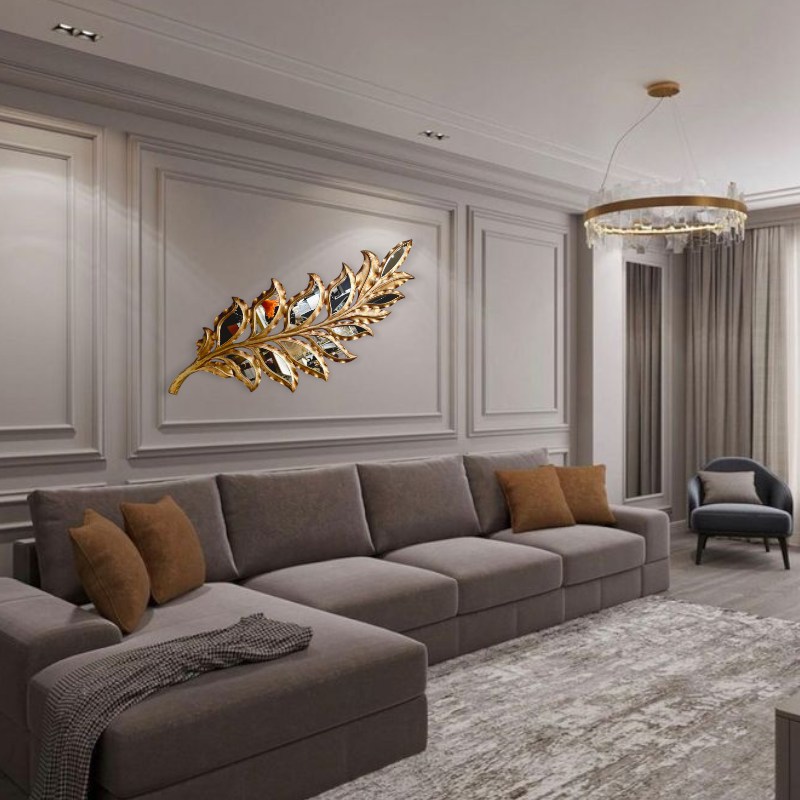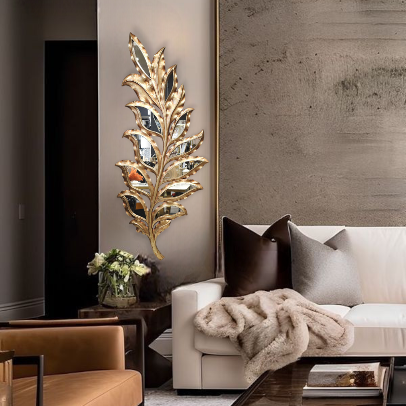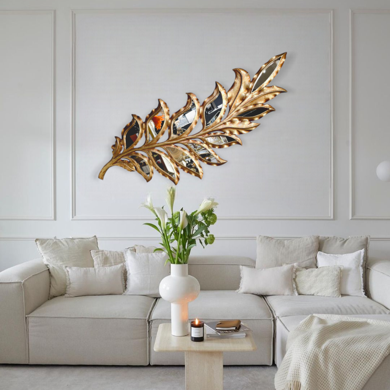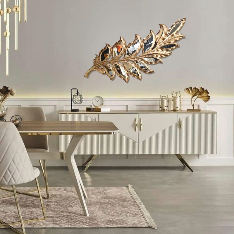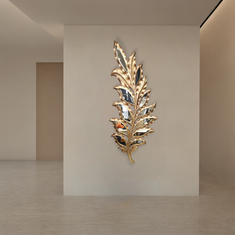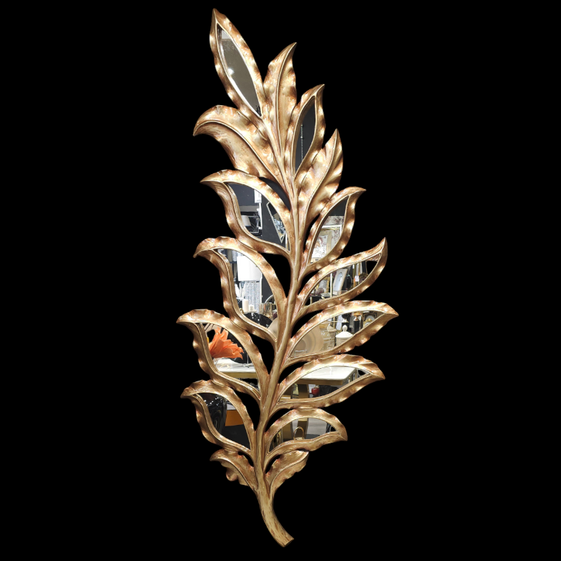 Ένας καθρέφτης με έντονο το στοιχείο της διακόσμησης,σε σχέδιο φύλλο που μπορεί να τοποθετηθεί κάθετο η οριζόντια,πάνω απο καναπέ, μπουφε και σε οποιοδήποτε αλλο σημείο του χώρου σας. Το υλικό ειναι συνθετικό ξύλο με λεπτομέρεια στην απομίμηση ενός πραγματικού φύλλου, χρώμα χρυσό .Διάσταση 1,80*0,80.