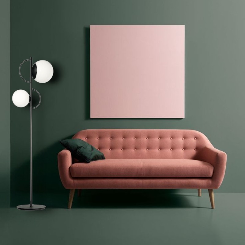 Ένα ιδιαίτερο φωτιστικό δαπέδου μεταλλικής κατασκευής σε μαύρο χρώμα. Διαθέτει μοντέρνο σχεδιασμό που συνδυάζει μέταλλο και λευκό γυαλί οπαλίνας. Διαθέτει υποδοχές για ένα λαμπτήρα Ε27 και ένα λαμπτήρα Ε14.