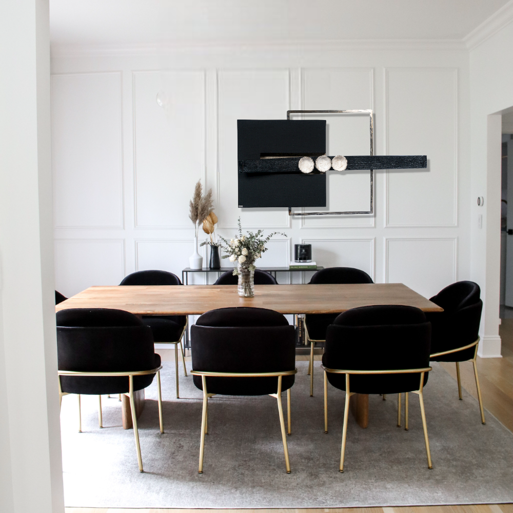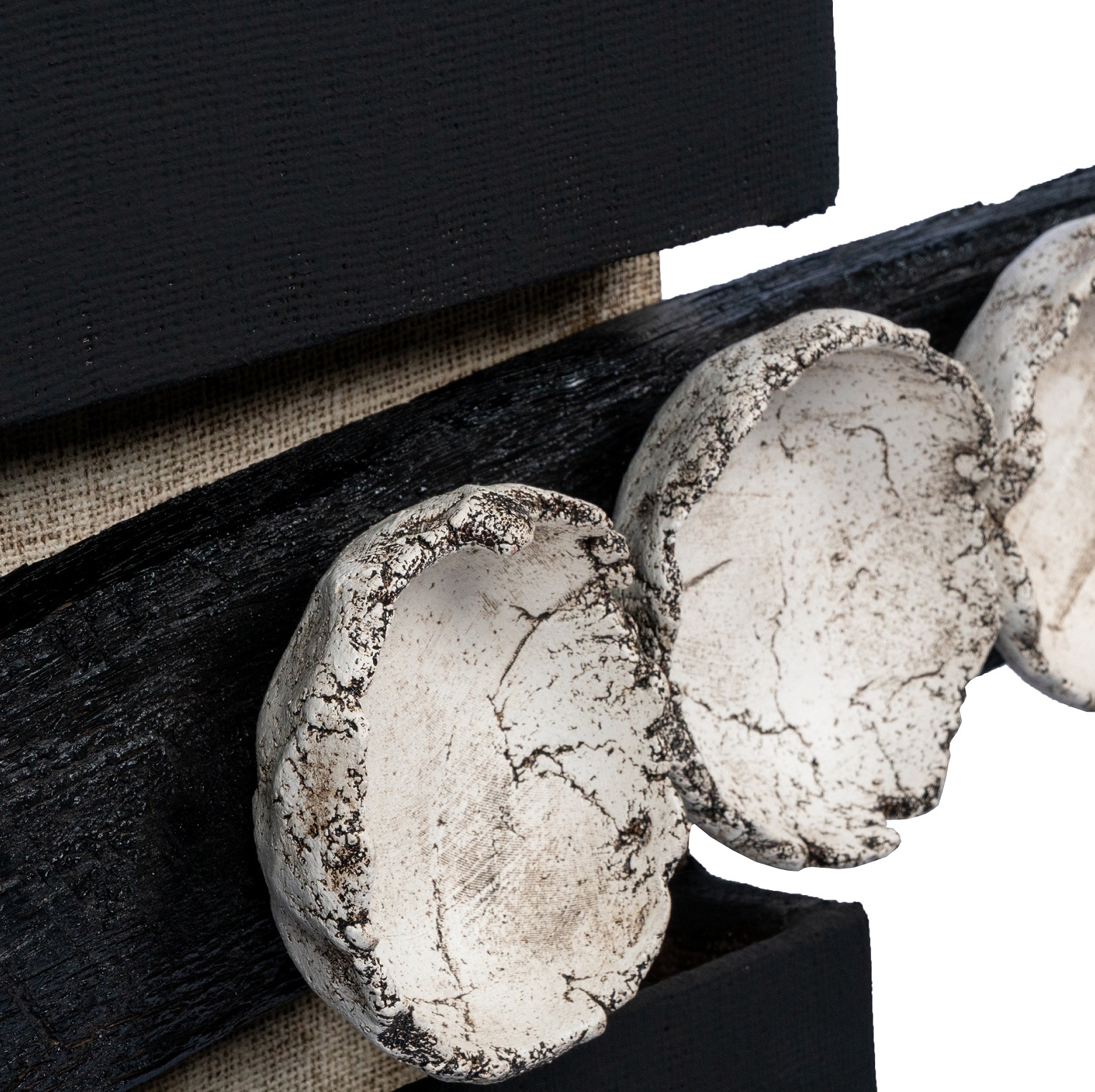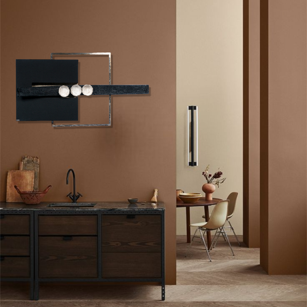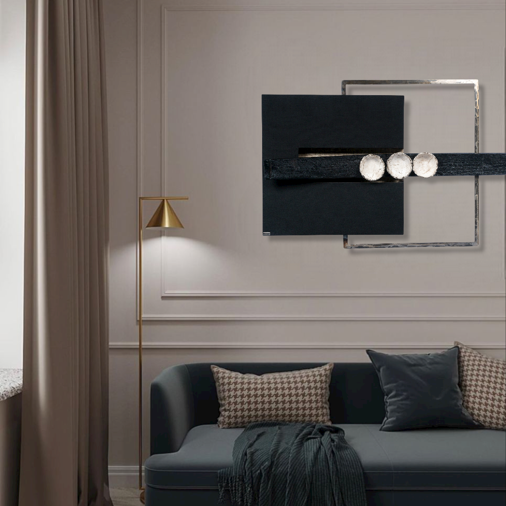 Ο πίνακας επενδύεται με λεπτή επεξεργασμένη τζούτα, ενώ το ανοικτό μέρος του συμπληρώνεται με κεραμικές κούπες, μεταλλικό πλαίσιο και φυσικό κουρμπαριστό ξύλο.