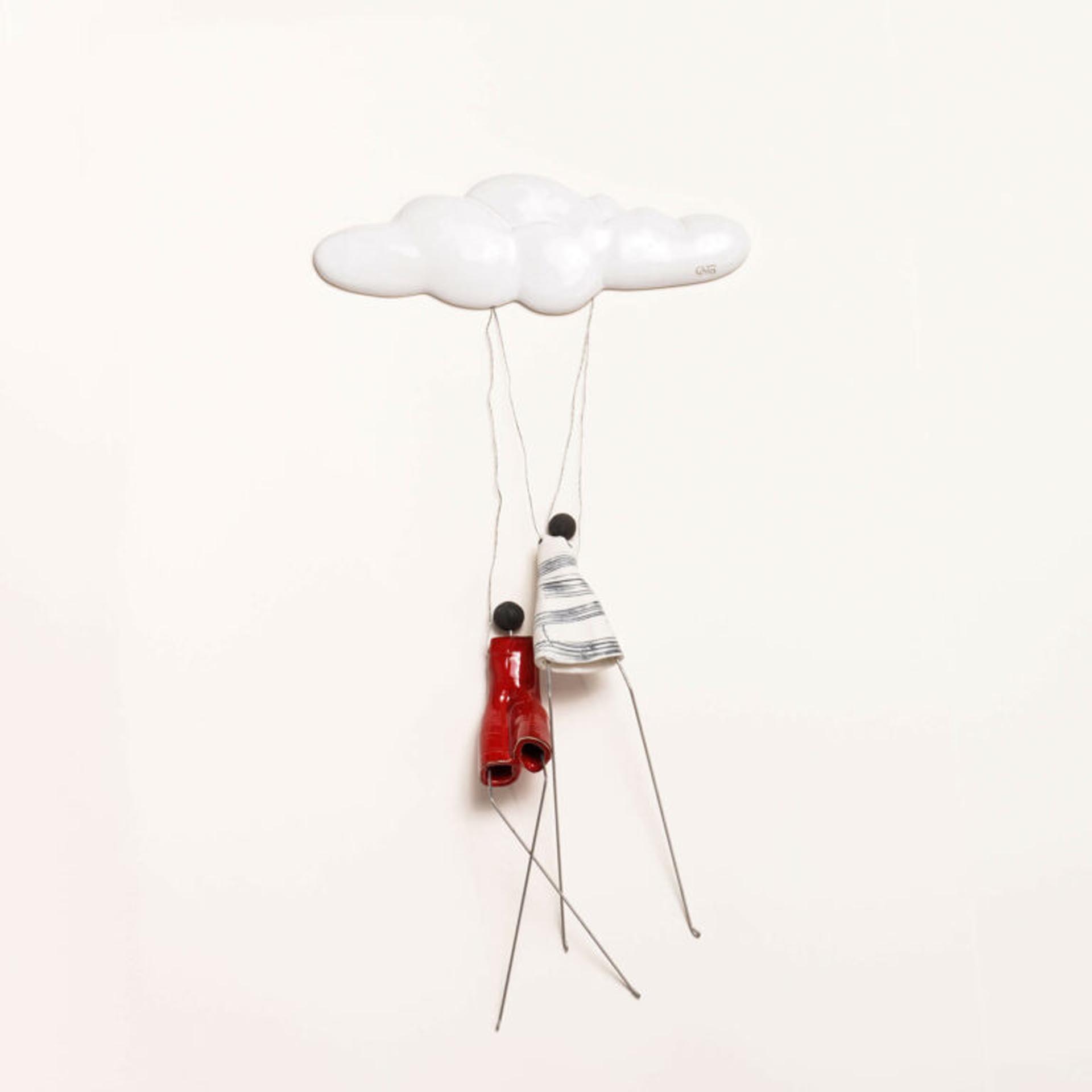 Ζευγάρι σε σύννεφο με φιγούρες από πορσελάνη και κόκκινο σμάλτο αιωρούμενες απο σύννεφο σε λευκό γυαλιστερό σμάλτο.