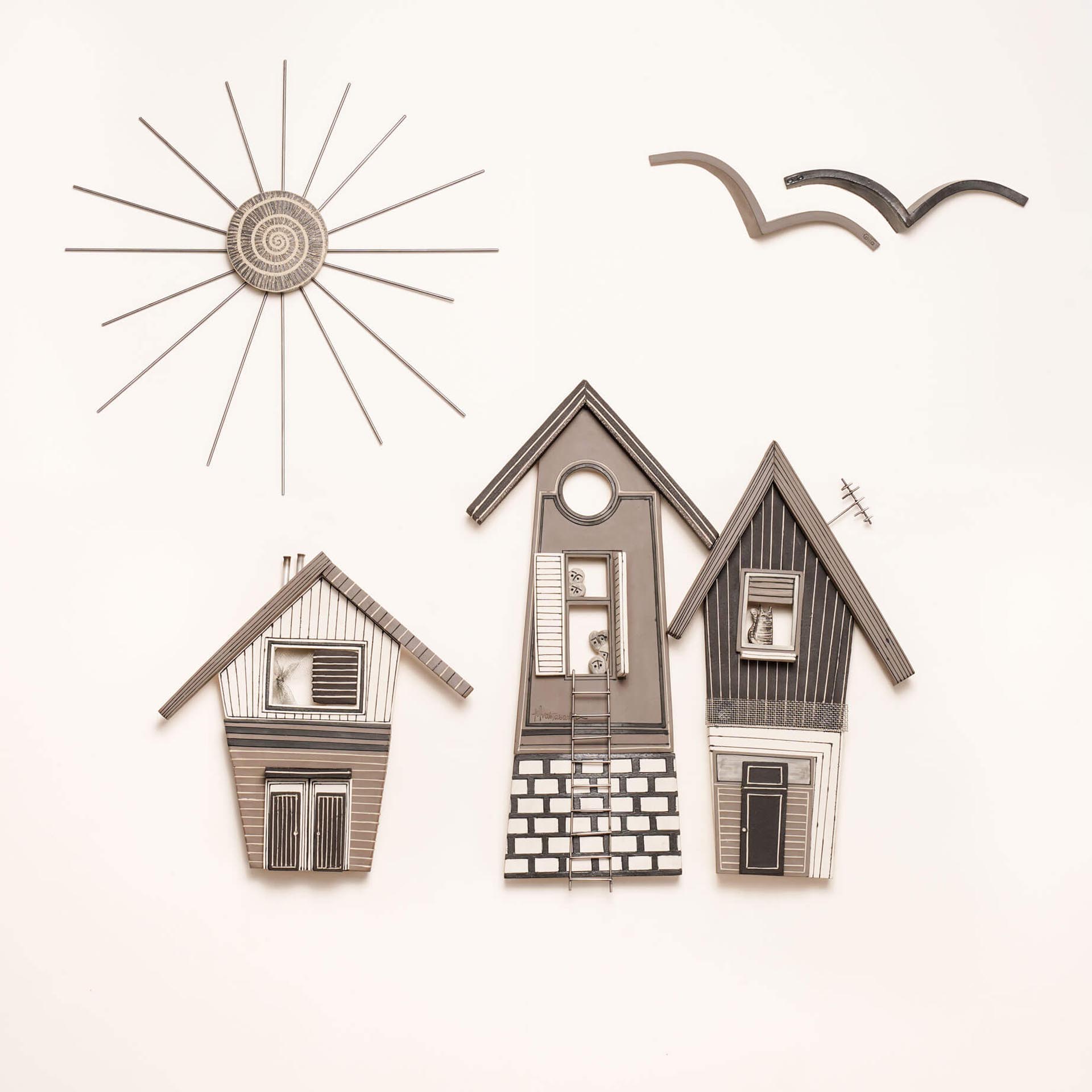 Τρίπτυχη σύνθεση με σπιτάκια τοίχου, απο φυσικά χρώματα πηλού stoneware μαυρο/γκρι/λευκό και ζωγραφιστά σημεία με ασπρόμαύρο μπαντανά.