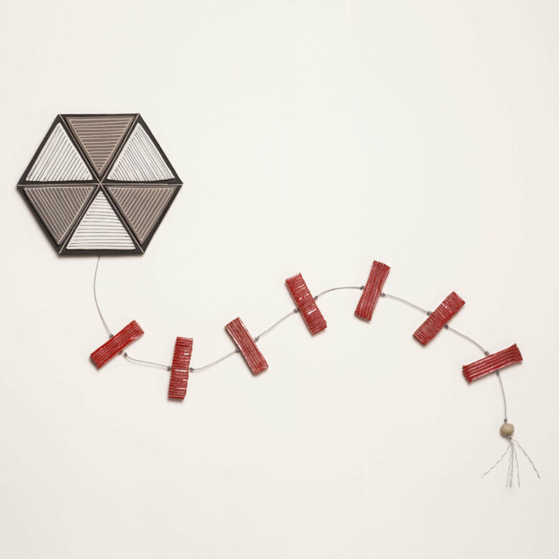 Χαρταετός πολύγωνος επιτοίχιος, από γκρι και μαύρο πηλό stoneware, συν πορσελάνη με λευκό και μαύρο χάραγμα εσωτερικά και ουρά με φιογκάκια σε κόκκινο σμάλτο.