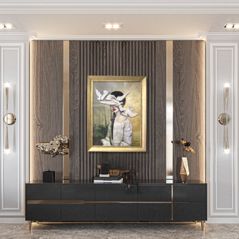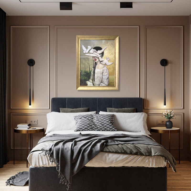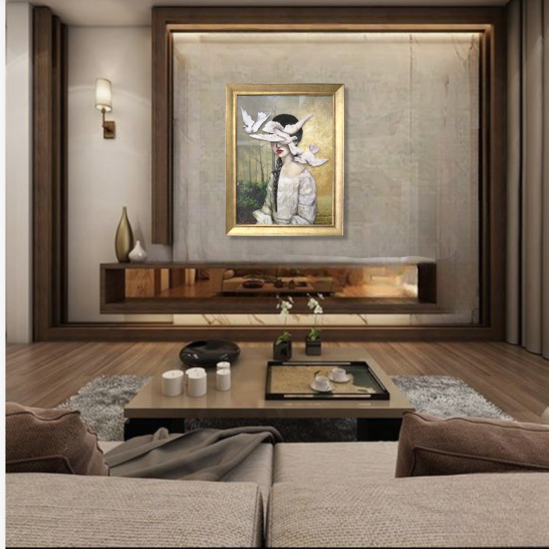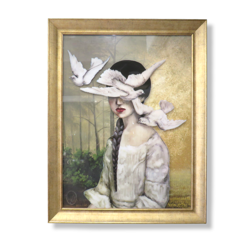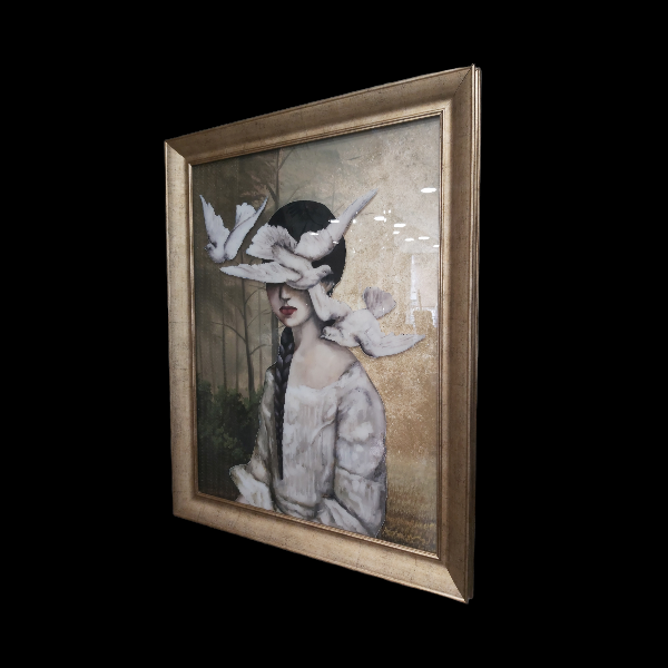 Πίνακας με ιδιαίτερο, χειροποίητο στολισμό και χρυσή κορνίζα με τζάμι.