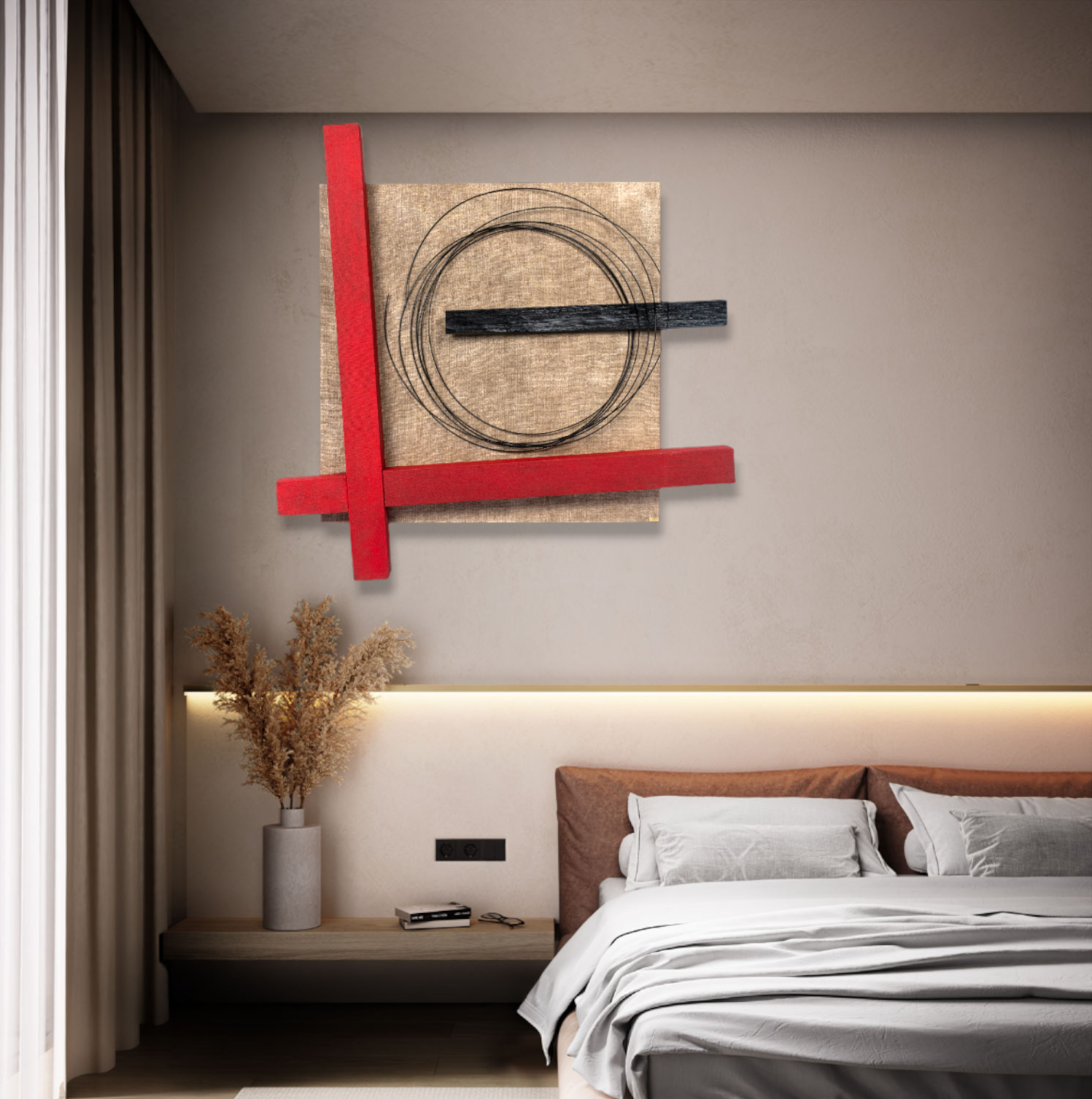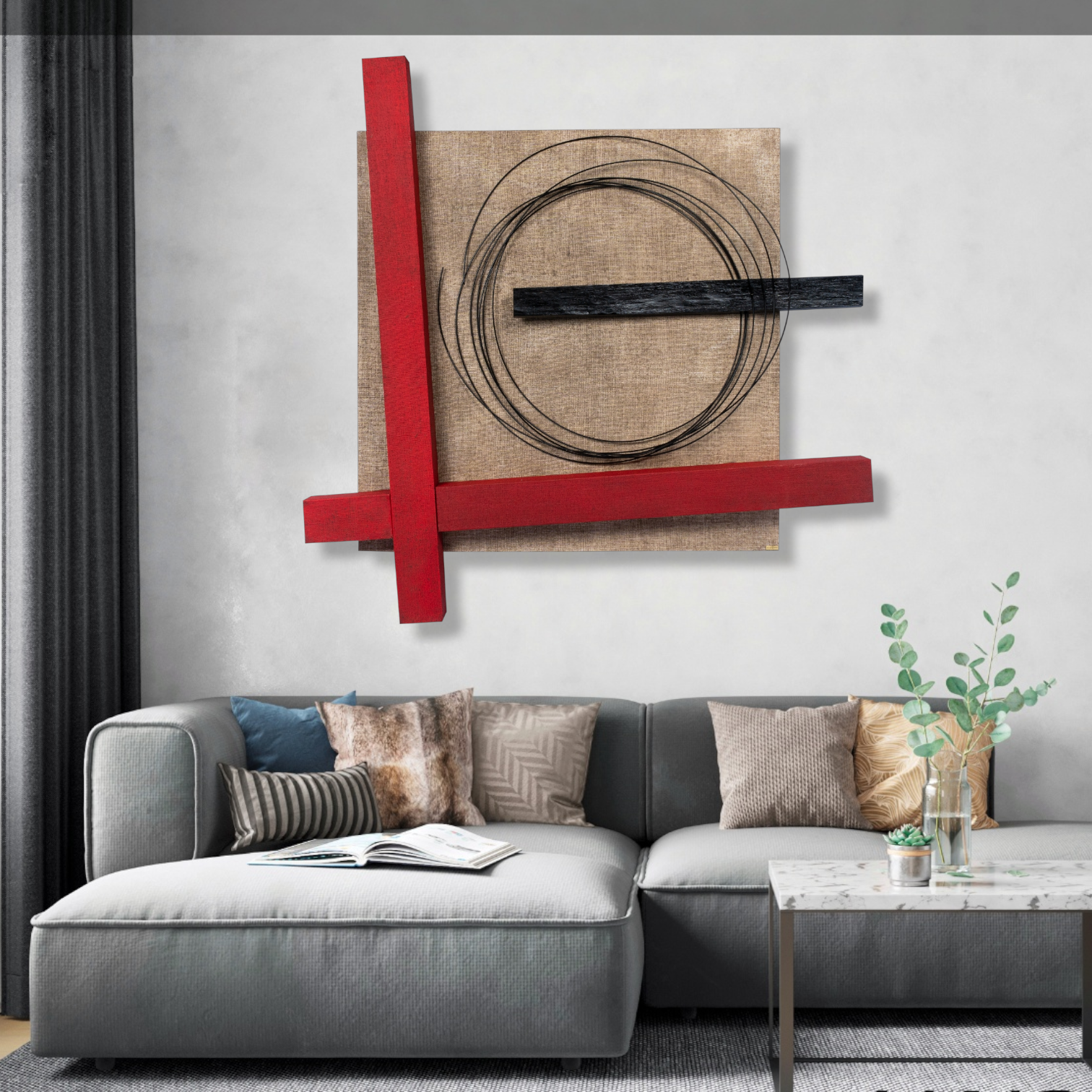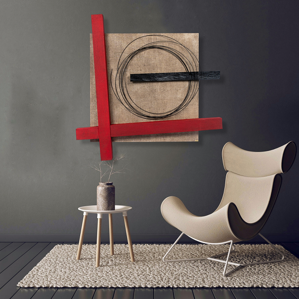 Το κεντρικό πλαίσιο επενδύεται με λεπτή επεξεργασμένη τζούτα, ενώ ο πίνακας ολοκληρώνεται με φυσικό κουρμπαριστό ξύλο και μέταλλο (μεταλλικοί κύκλοι).