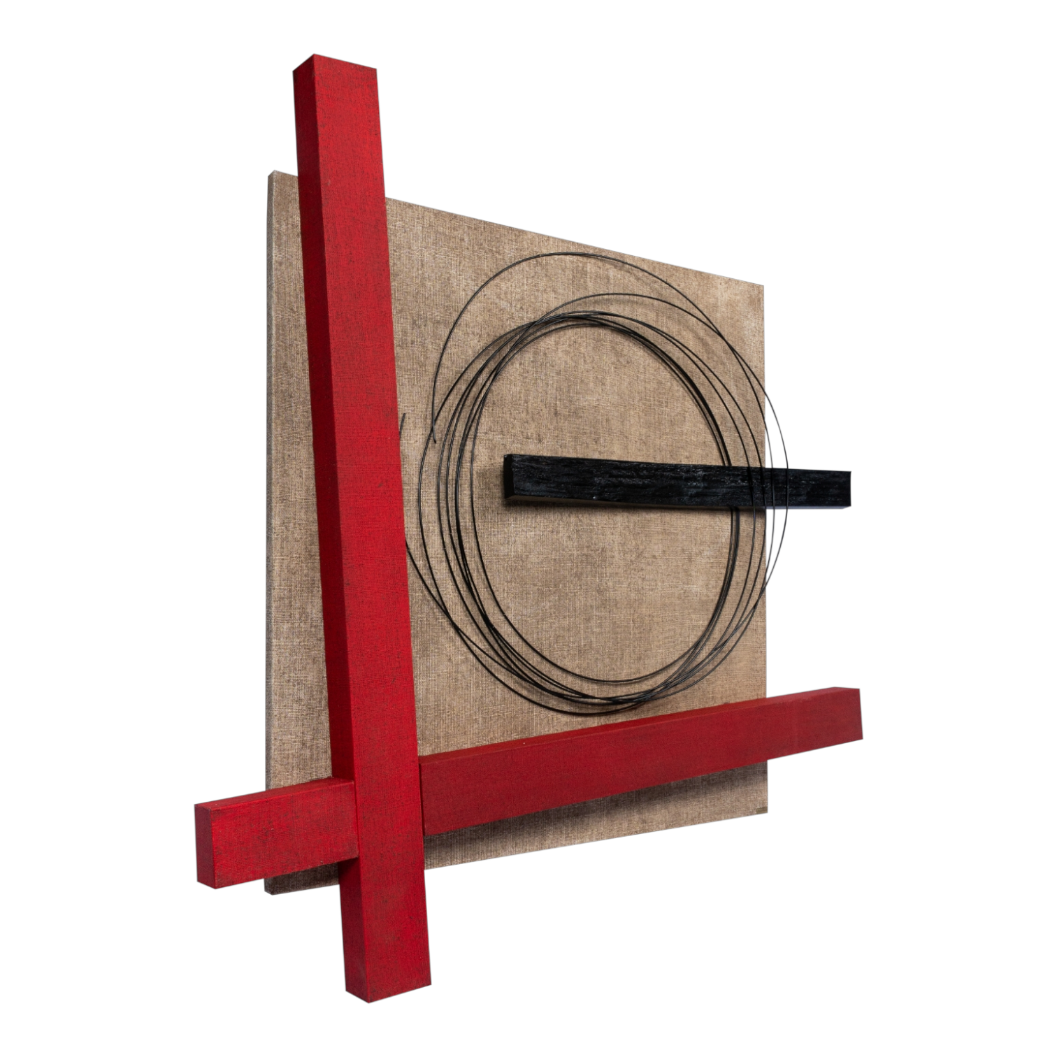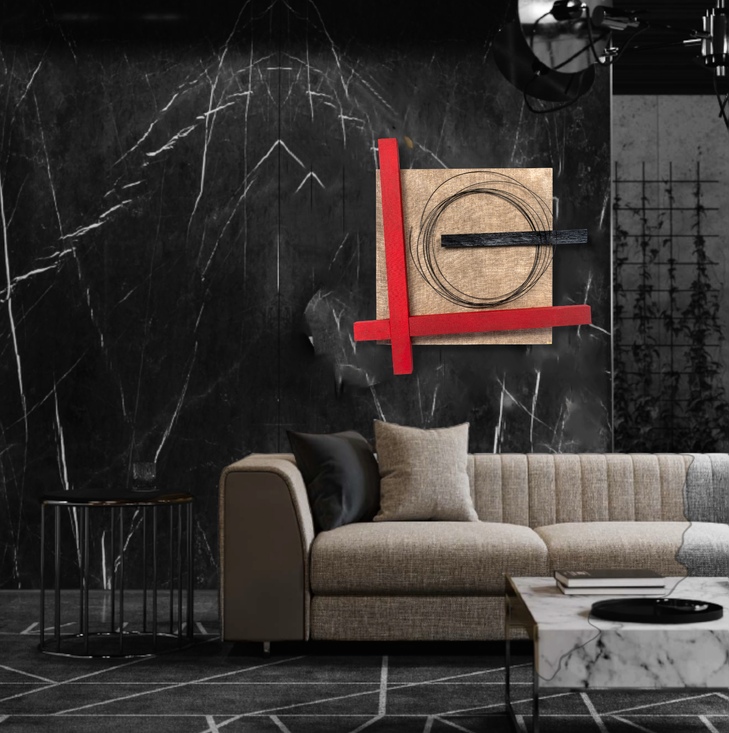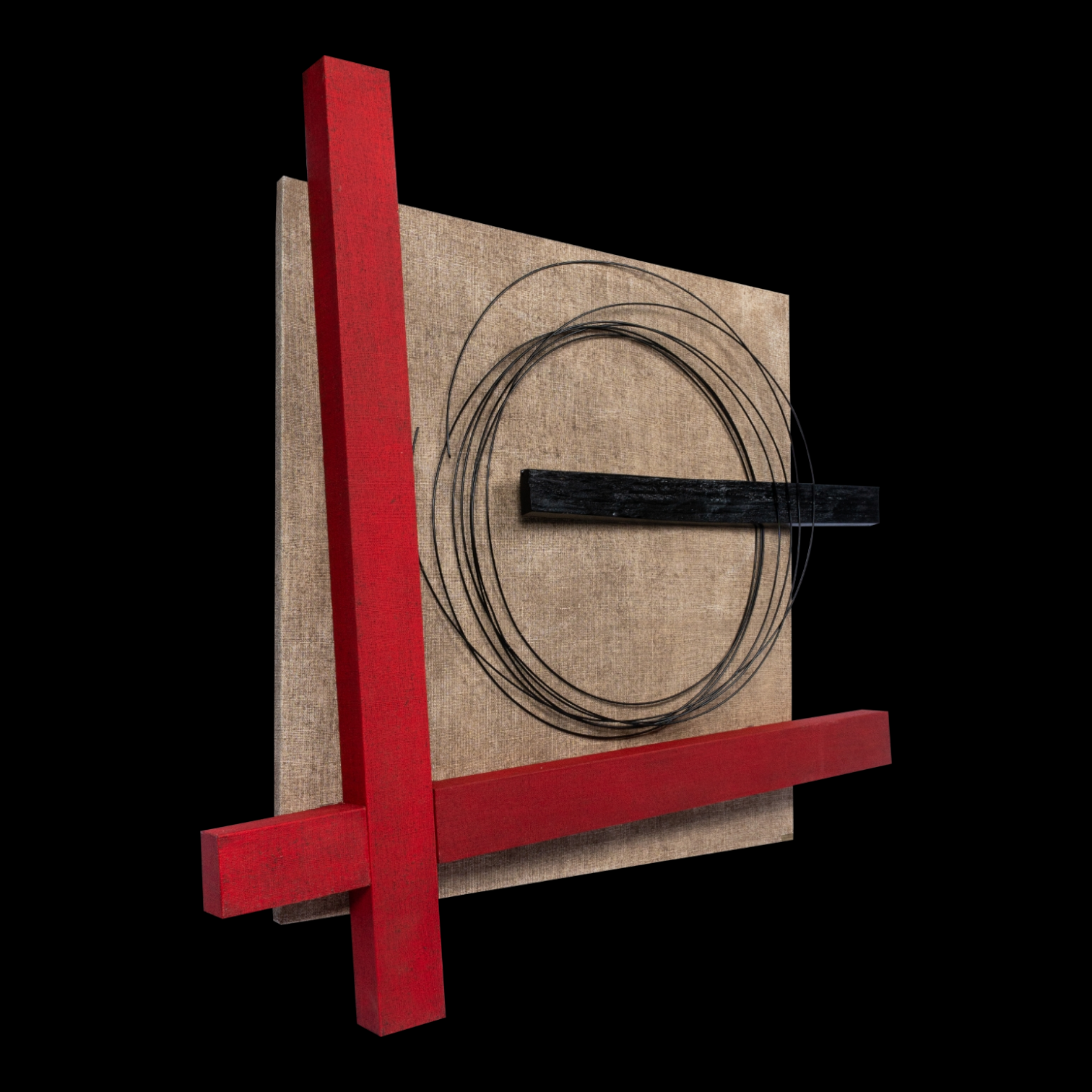 Το κεντρικό πλαίσιο επενδύεται με λεπτή επεξεργασμένη τζούτα, ενώ ο πίνακας ολοκληρώνεται με φυσικό κουρμπαριστό ξύλο και μέταλλο (μεταλλικοί κύκλοι).
